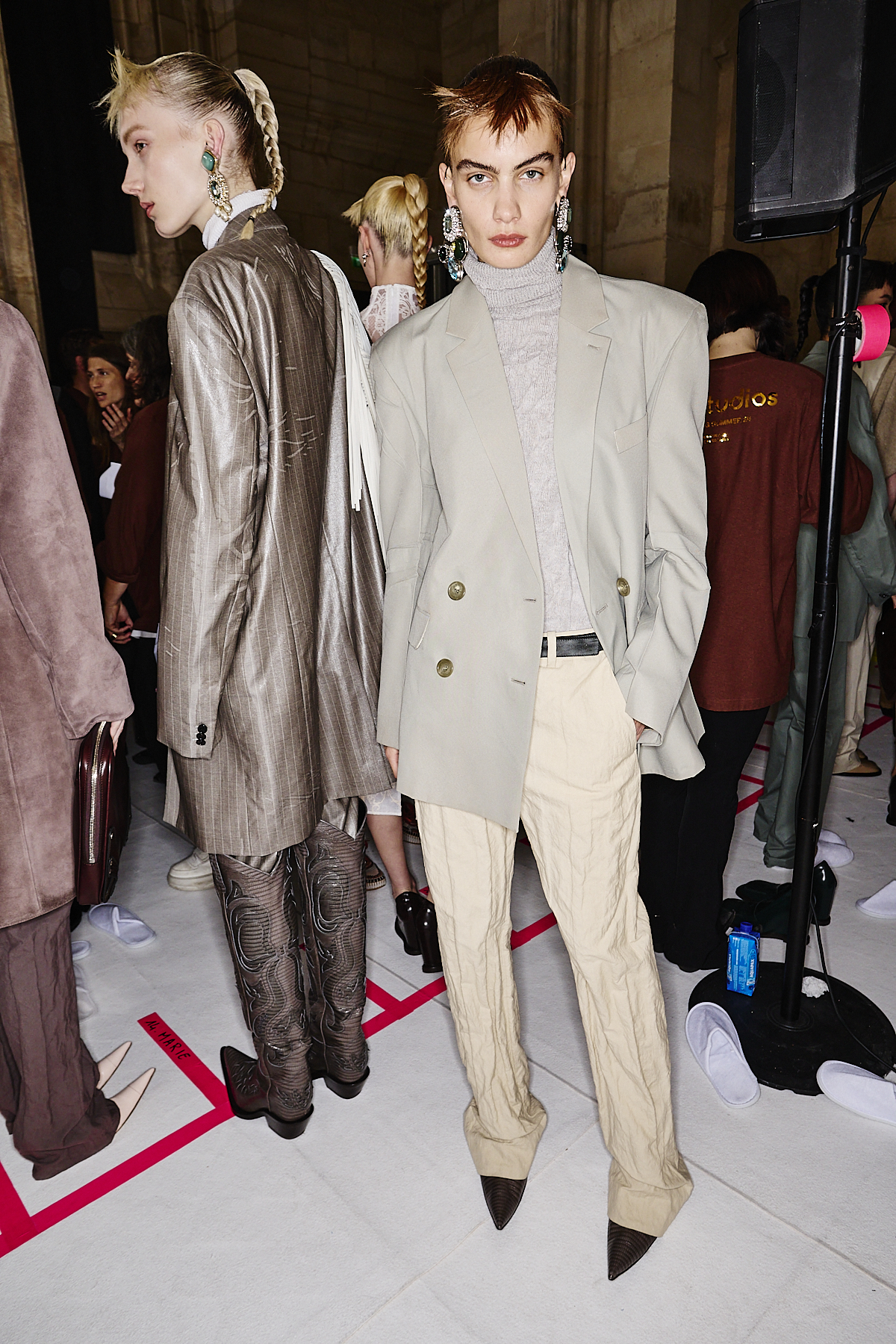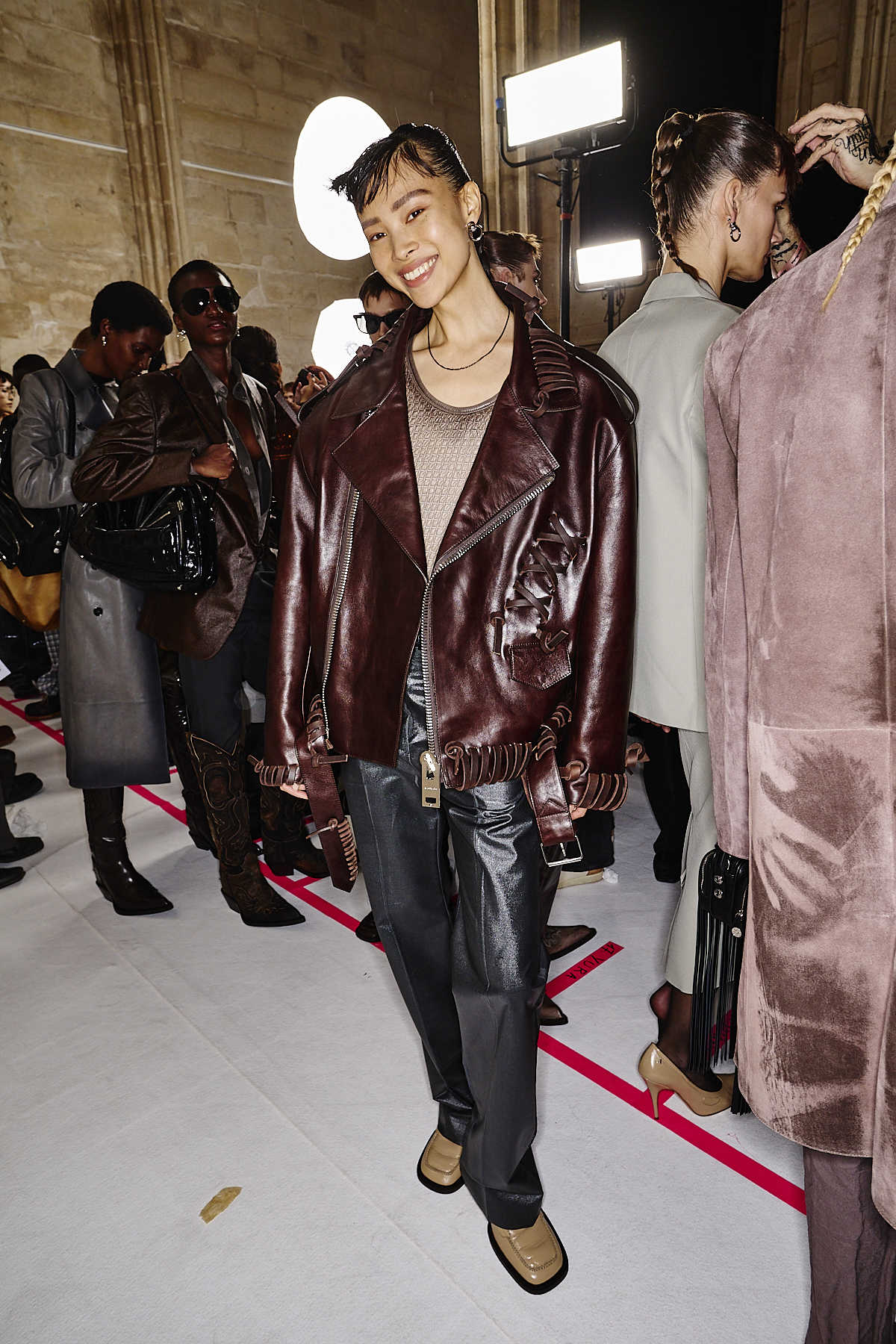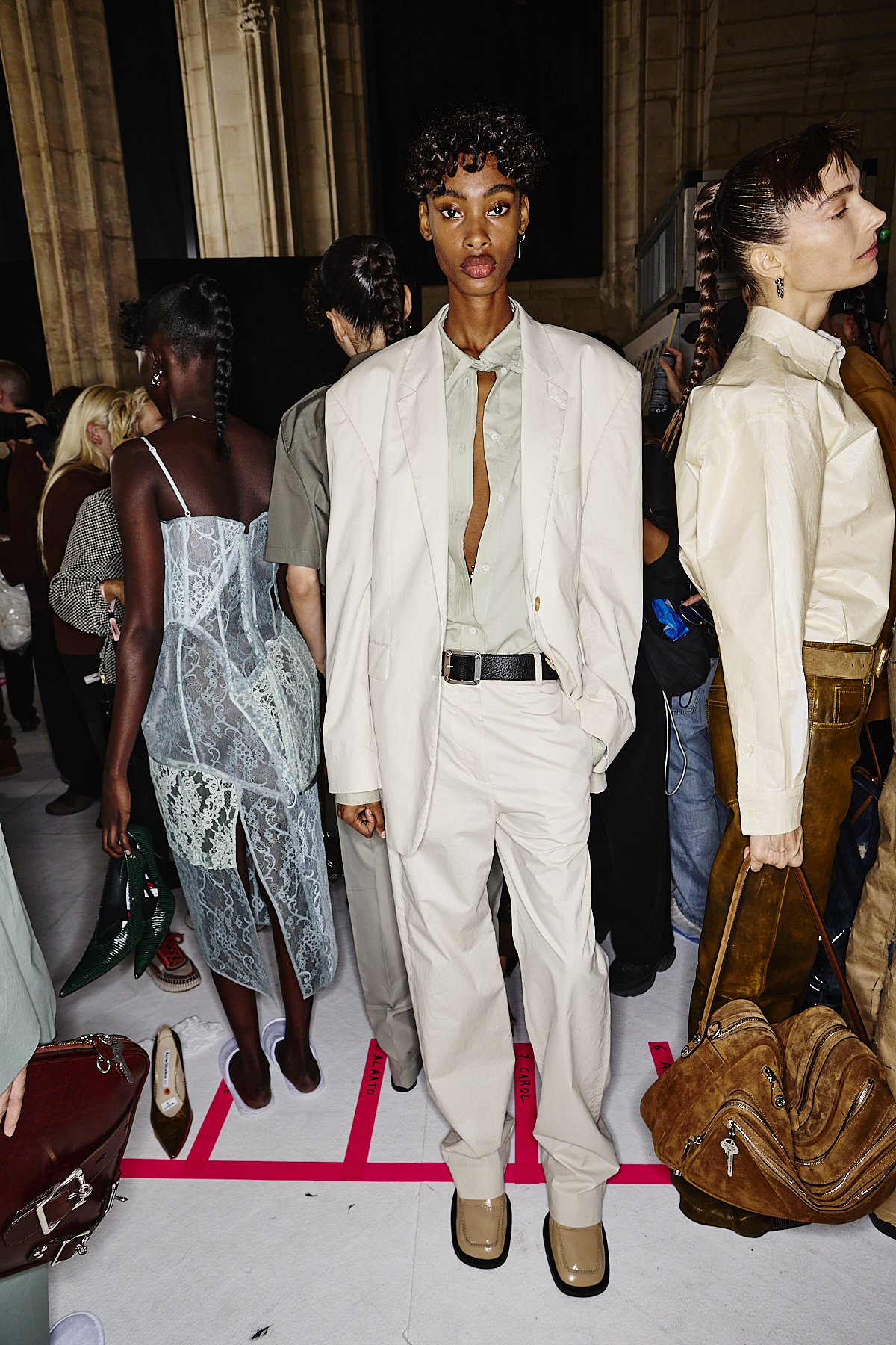 For Acne Studios’ S/S 26 show, the brand led by Jonny Johansson stayed true to its tradition of collaborating with artists on set design. This season, they tapped not one but three visual talents for the scene: Jonathan Lyndon Chase, Lukas Gschwandtner, and Pacifico Silano, known for their work that reinterprets queer erotica and ephemera from the 1970s and 1980s. The imagery wrapped around the 13th-century Gothic church Collège des Bernardins, where Acne staged the show in a setting that resembled a moody cigar salon. Cast by Piergiorgio Del Moro, Libby Bennett opened up the show, dressed in a tonal look of a tan tank, matching pants, and an oversized hazelnut blazer, styled by Tamara Rothstein, her first time styling the brand’s show. The collection featured sharp-shouldered power suits in slate grey, exaggerated plaid coats, and frayed denim, echoing a Western-meets-urban cityscape romanticism. Amid the rugged tailoring were feminine contrasts, like corseted dresses with high necklines and delicate mini-belts, rendered in milky white and smoky grey.