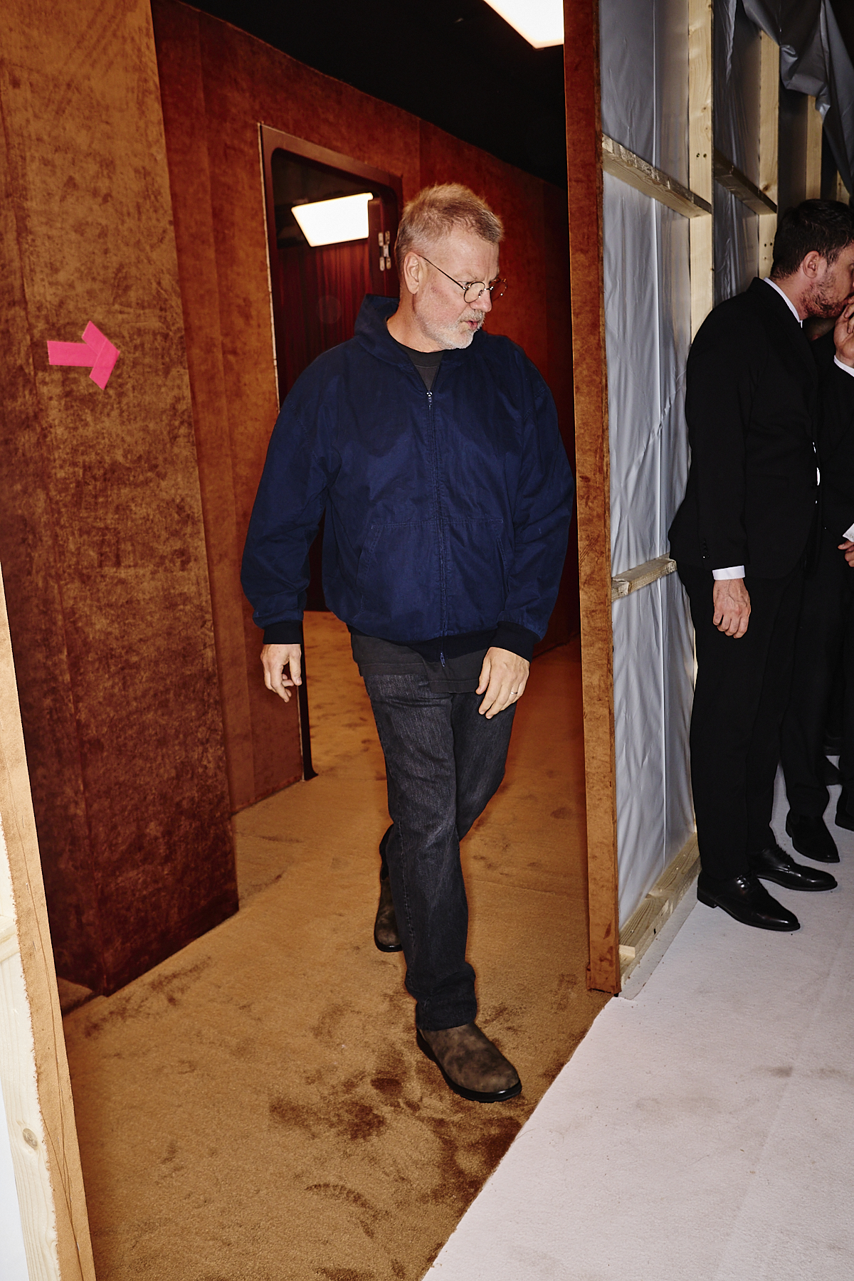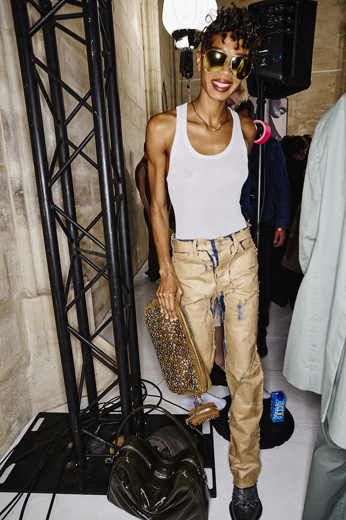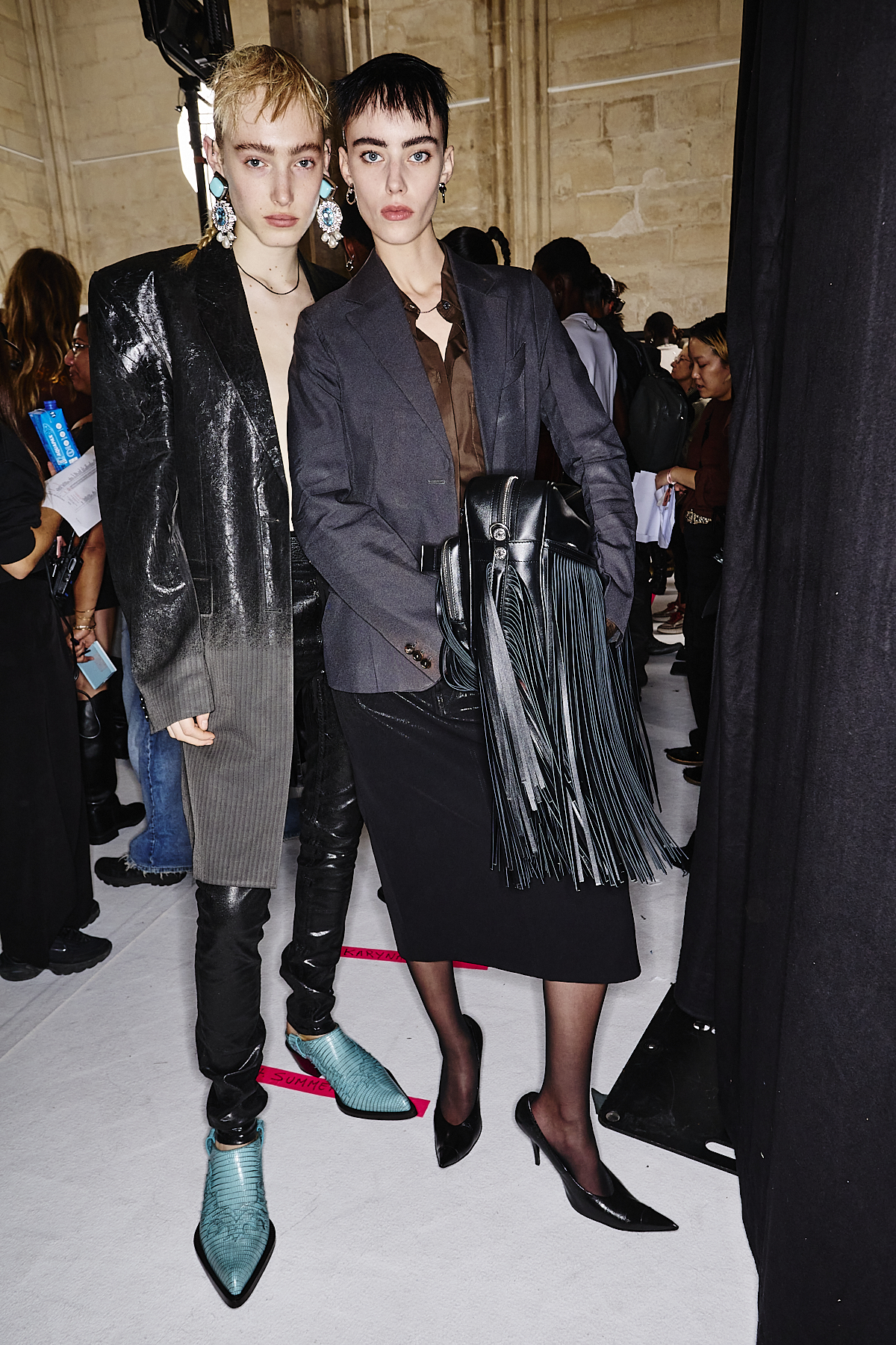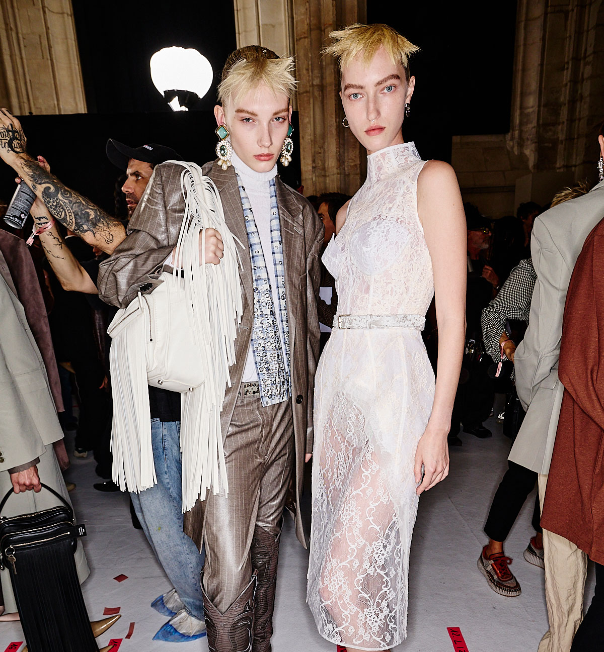 For Acne Studios’ S/S 26 show, the brand led by Jonny Johansson stayed true to its tradition of collaborating with artists on set design. This season, they tapped not one but three visual talents for the scene: Jonathan Lyndon Chase, Lukas Gschwandtner, and Pacifico Silano, known for their work that reinterprets queer erotica and ephemera from the 1970s and 1980s. The imagery wrapped around the 13th-century Gothic church Collège des Bernardins, where Acne staged the show in a setting that resembled a moody cigar salon. Cast by Piergiorgio Del Moro, Libby Bennett opened up the show, dressed in a tonal look of a tan tank, matching pants, and an oversized hazelnut blazer, styled by Tamara Rothstein, her first time styling the brand’s show. The collection featured sharp-shouldered power suits in slate grey, exaggerated plaid coats, and frayed denim, echoing a Western-meets-urban cityscape romanticism. Amid the rugged tailoring were feminine contrasts, like corseted dresses with high necklines and delicate mini-belts, rendered in milky white and smoky grey.