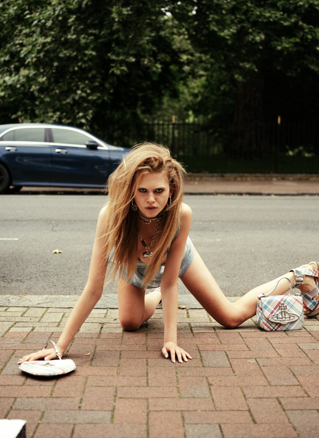 For this Vivienne Westwood campaign, we were inspired by Juergen Teller’s go-sees. It was really easy with Mila, who could snap her fingers and move into something like 99 different acrobatic positions on the ground. It is always kind of electrifying to step into the middle of the street and ask someone to command attention in a public space like this. It kind of feels like streaking, or like peeing behind a car.