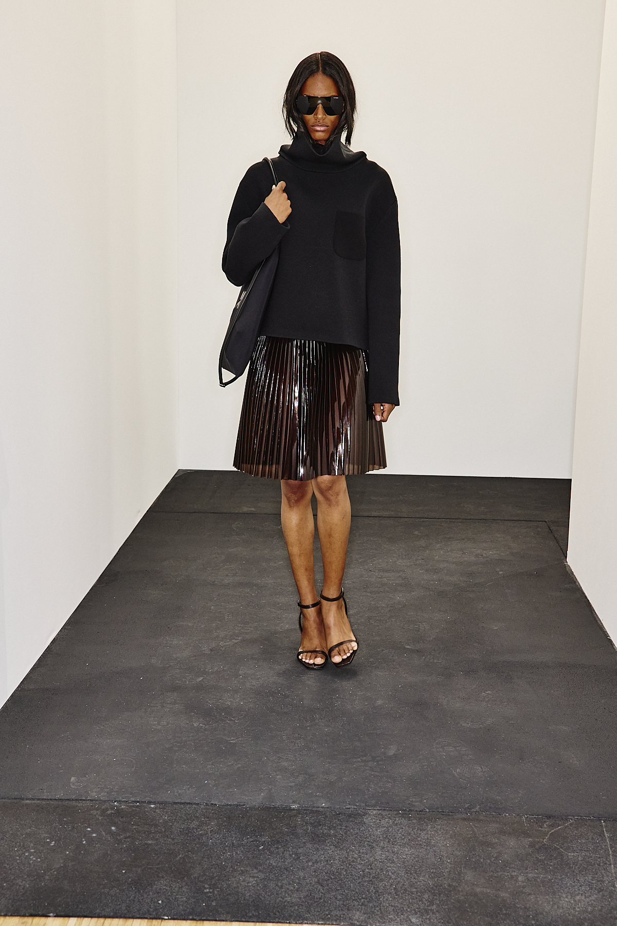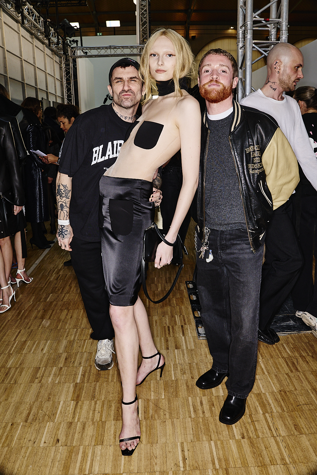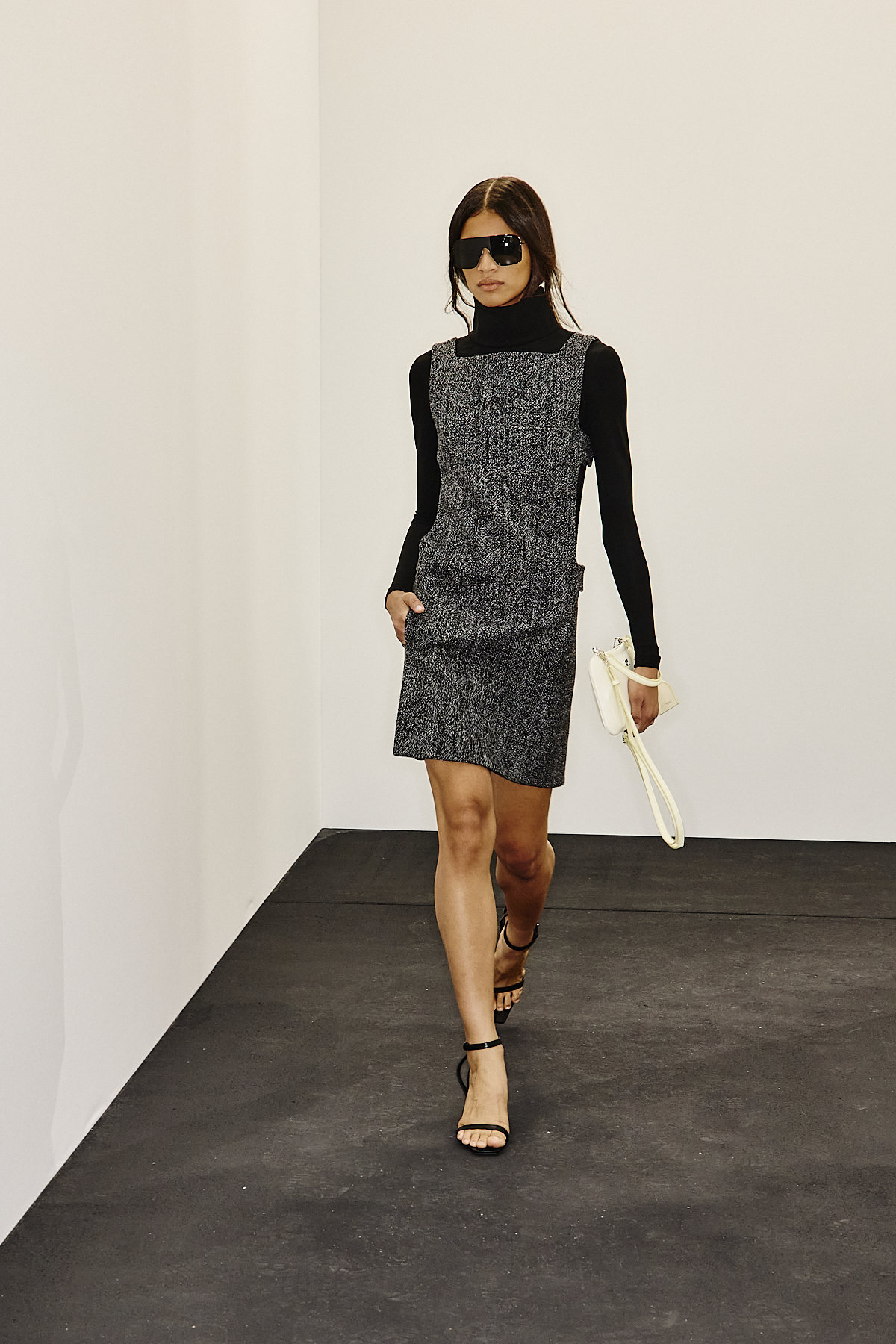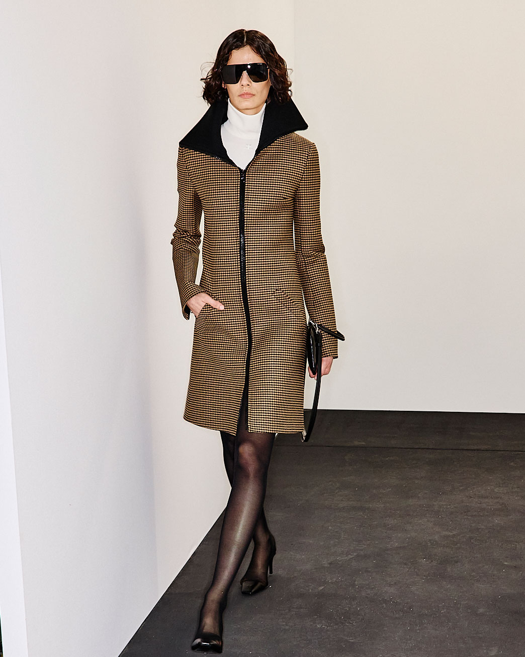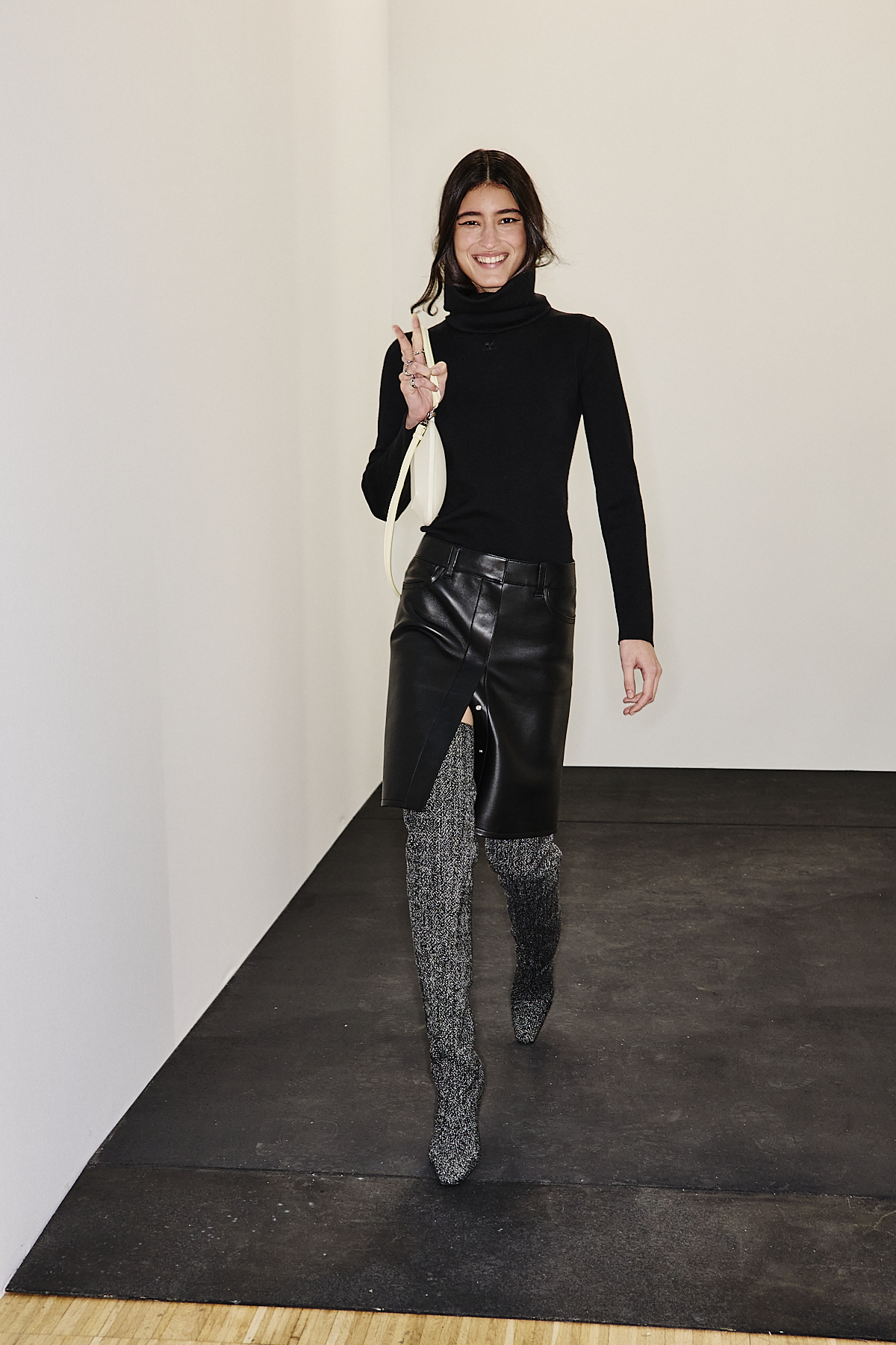 For Courrèges’ F/W 26, creative director Nicolas Di Felice looked to cinema, drawing inspiration from Portrait of a Young Girl at the End of the ’60s in Brussels, Chantal Akerman’s coming-of-age portrait of urban solitude. Titled 24 Hours in the Life of a Courrèges Woman, the collection traced a day in motion, from morning commute to late-night adventures, with Di Felice leaning into the sharp geometry and sensuality that have become his signature. Cast by Julia Lange, Reagan Lee opened the show, her first time opening a runway, on a narrow set designed to echo the rhythm of Parisian streets, complete with manholes and marble paving. She appeared in an all-white halter-neck satin dress with an oval cut and high slit, styled by Marie Chaix. From there, Di Felice balanced seductiveness with athleisure, pairing quarter-zip bodysuits, jackets, and asymmetrical trenches with sculptural draped skirts,cocktail dresses and skirts featuring organza coat-check tag motifs.The color palette remained largely monochromatic. Mesh tops with barely-there black striping appeared on Stella Hanan and Alex Consani, while structured oversized turtlenecks, sharp pencil skirts, and tailored silhouettes introduced a subtle office-siren sensibility. For the final walkthrough, several earlier looks shown in onyx black returned in white variations. Accessories sharpened the mood, including knee-high boots with a glossy, almost latex-like finish, tweed accents, and oversized black glasses. With its structured silhouettes and cinematic pacing, Di Felice delivered a wardrobe for a woman constantly on the move; precise, subtly sensual, and unmistakably Courrèges.