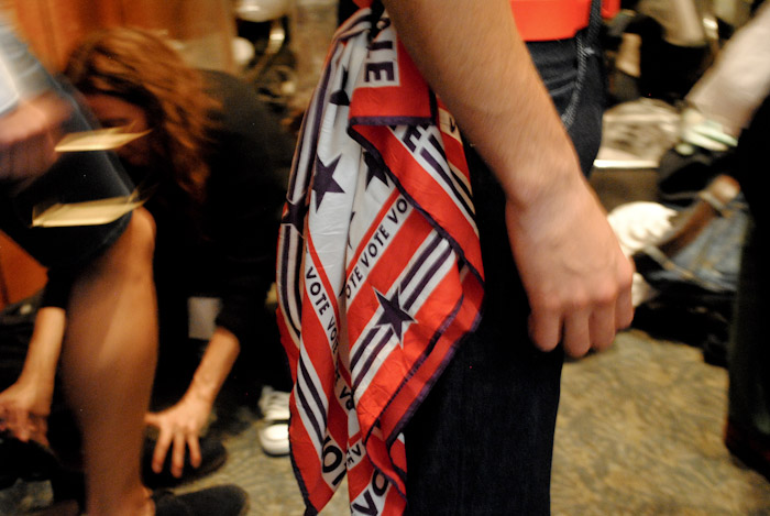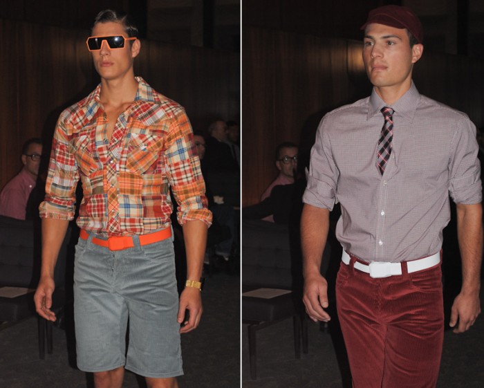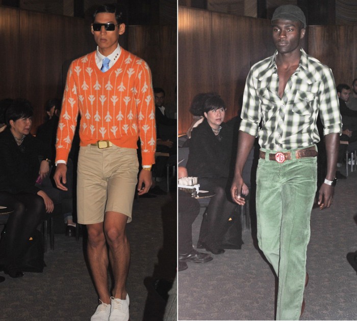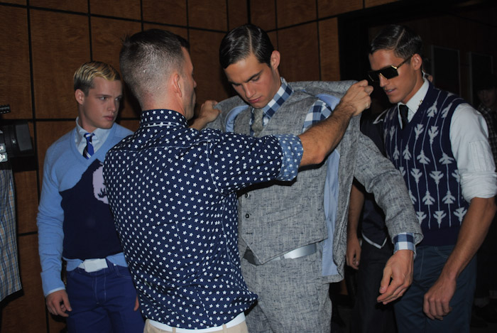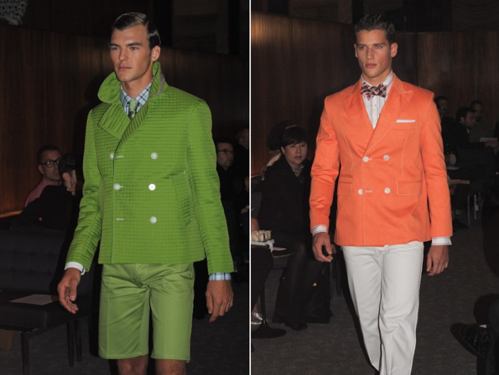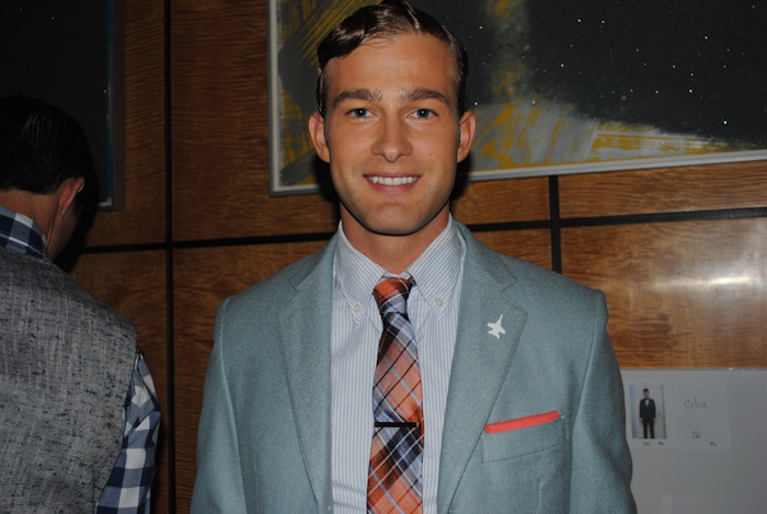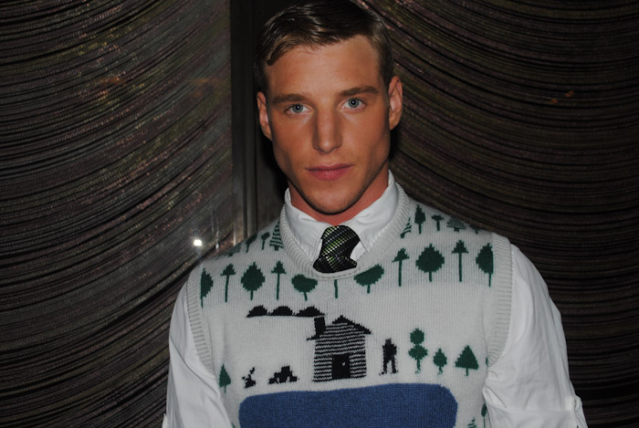 It was dimmer than usual in the Grill Room at the Four Seasons when up-and-comer Marlon Gobel showed his Spring 2011 collection on a rainy Sunday afternoon. The menswear designer, an alum of both Thom Browne and Michael Bastian, lodestars of very American design, chose a setting evocative of decades of power lunches and corporate might for his second collection, a group of looks that harkened back to iconic ideals of American strength, from bankers and lumberjacks to fighter pilots and cowboys. Gobel’s show was easily the most sophisticated of the week, the guests in their Upper East Side weekend clothes sipping water as they perched on the lined-up banquets. The conversation hummed, rather than roared, as if the location itself were a warning against poor manners; even the dressers backstage talked in hushed whispers. The clothes themselves were sophisticated and sharp, from the white latticework jacket that opened the show to the “American forest sweater,” with an image of a simple wooden house surrounded by trees. Checked suits and madras shirts recalled visions of power from the worlds of industry and the frontier, while pullovers depicting ocean waves and a print of fighter jets evoked more modern paragons. Candy-colored sunglasses, belts, and watches from Nooka added a contemporary grace note. The model in the final look, a navy tuxedo, was accompanied by a woman with pulled-back hair in a white blouse and navy skirt, whom he helped up and down the stairs as the cameras flashed. The pair made eye contact halfway down the runway and smiled at each other, as if reminding themselves that, as Americans, they should never take anything too seriously. “I was thinking about this idea of Mr. America,” Gobel explained about his inspiration for the collection after the show. “He was a titan of industry, charm, and manners.” Individual items were responses to specific thoughts; the forest sweater, for example, came from the idea that “every guy wants a little country home.” And Gobel described the show’s three key “accessories”— an army green Stanley lunchbox with attached thermos, a briefcase handcuffed to a model’s wrist, and that gorgeous girl at the end—thus: “It’s the three things every American man needs: a healthy lunch, to be organized, and a woman with him to help take care of him.”