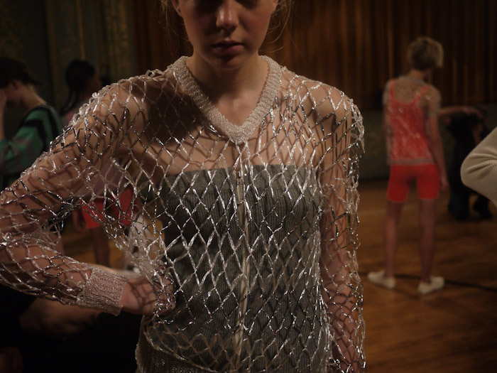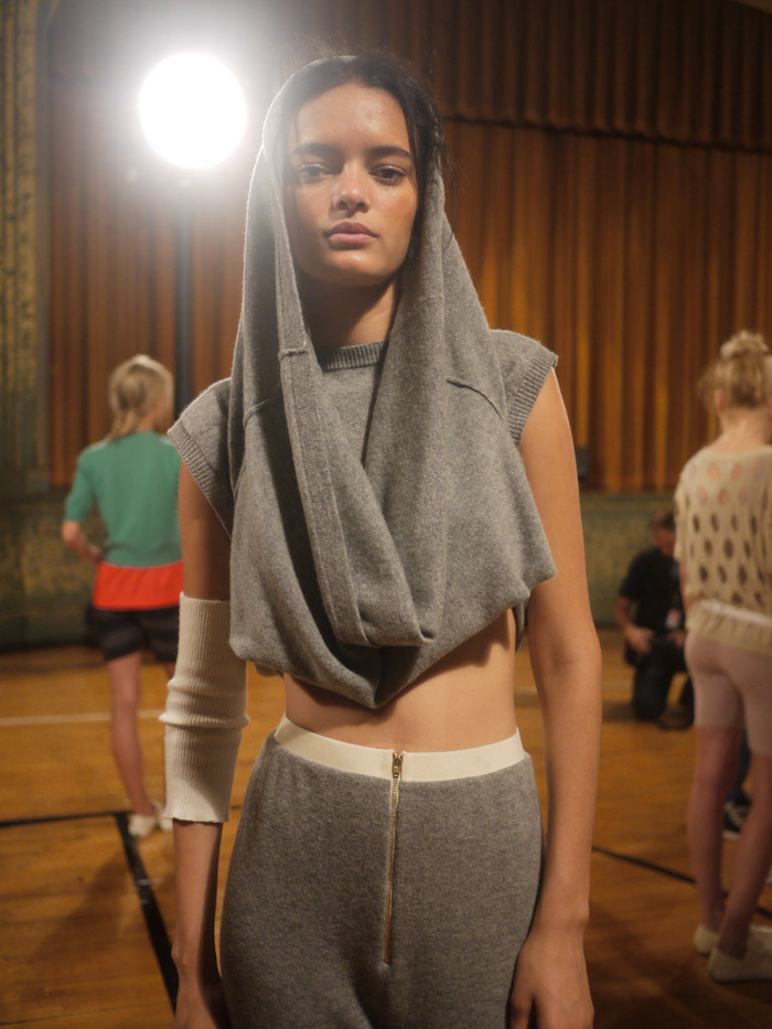 To capture the youthful vibe of his Spring collection Tom Scott staged the entire affair in the gym of West Village’s Notre Dame High School. The lively presentation gave the models the chance to act like kids and editors a chance to get a good look at Scott’s intricate knits and richly detailed separates. Taking everyday fixtures like jersey and turning them on their heads with his unique interpretations, Scott created a look all his own; a little preppy, a little undone, but completely wearable. The cutout sweaters and silver mesh jackets are sure to be editorial favorites, while relaxed pieces like his one of a kind take on the sweatsuit will soon be seen on the backs of cool girls everywhere.