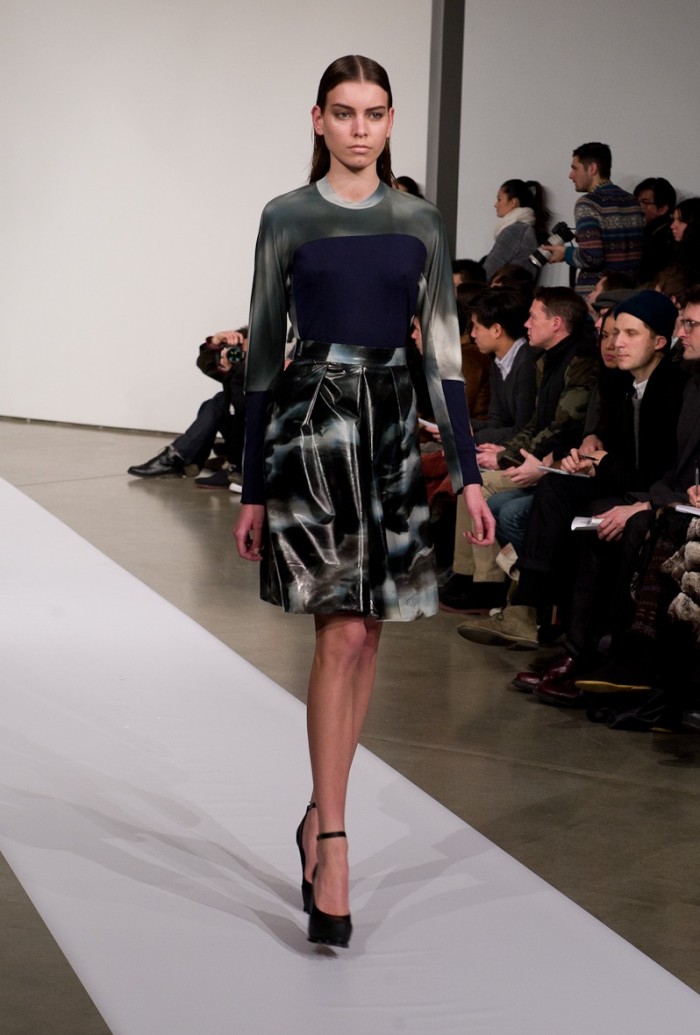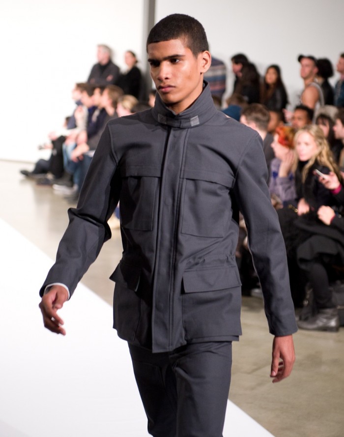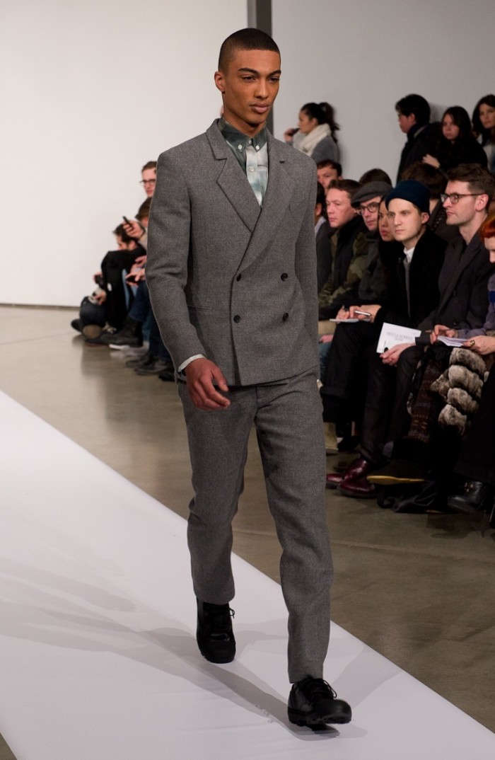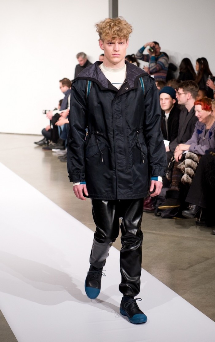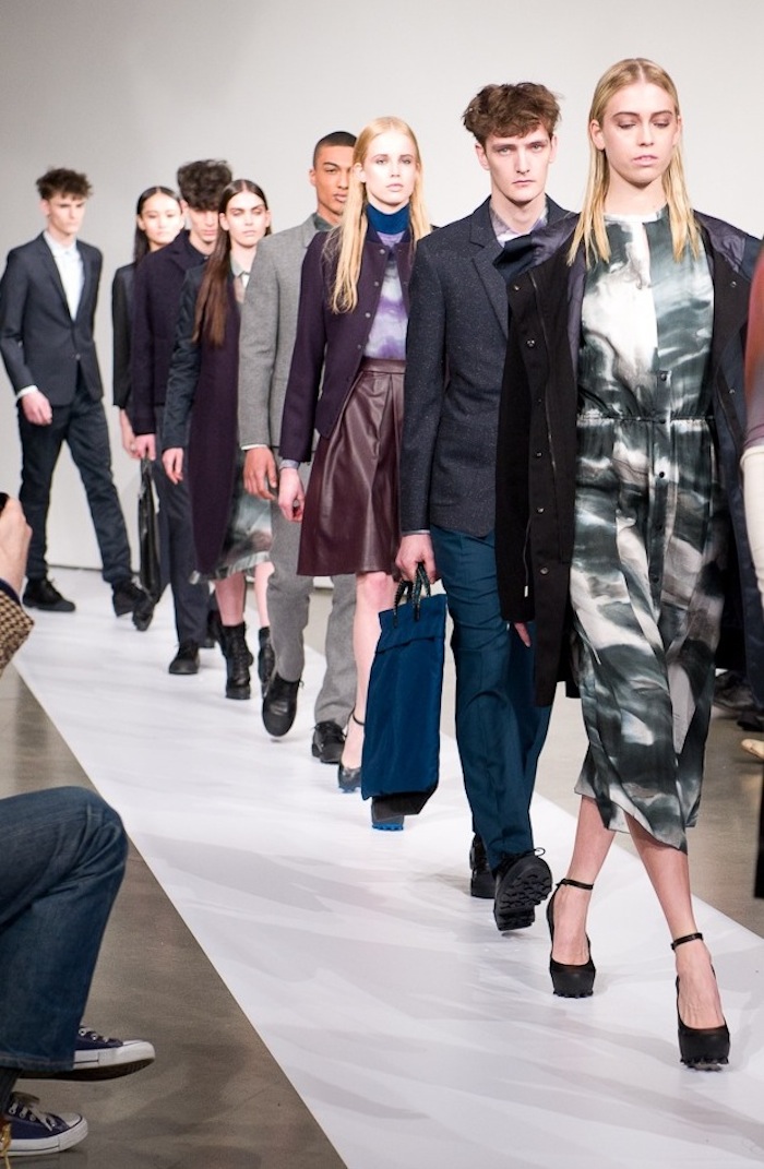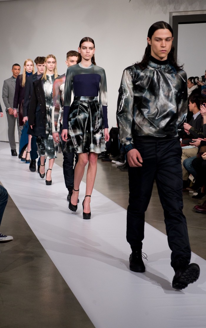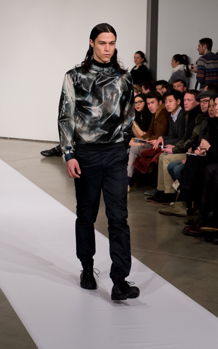 For Patrik Ervell’s second season showing full collections for both men and women, the designer found inspiration in the clash between protest movements and authoritarian states, adding a police uniform twist to the clean, minimalist aesthetic that has proven so powerful in his hands. The season’s emphasis on performance wear and athletics was manifested in swat jackets and field coats that were a more civilian version of the toned-down military look that Ervell favors. Russell Giardina’s opening tactical police sweater bulked up from padding around the shoulders, a look that proved equally accessible for women. With this collection, Ervell, long the go-to designer for New York’s cool, artsy guys, has proven that he is just as talented designing for the fairer sex. Materials and colors crossed over between the genders, and there was a sleekness to the simple lines of the girls’ overcoats and long dresses that matched the elegant directness of the guys’ sharp suits.