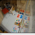Brendan: I took naps, usually in the looks that had sunglasses. I read a book that Scott gave me called Breakfast of Champions by Kurt Vonnegut, which I liked a lot. I also drew pictures, took photographs, and painted all of the protesting signs in my compartment with the stencils they gave me. I really took my time and did a good job. They were aligned and centered perfectly and had the same color schemes as the quotation marks on the pins and in the collection.