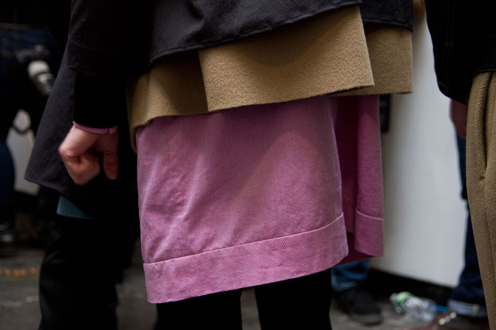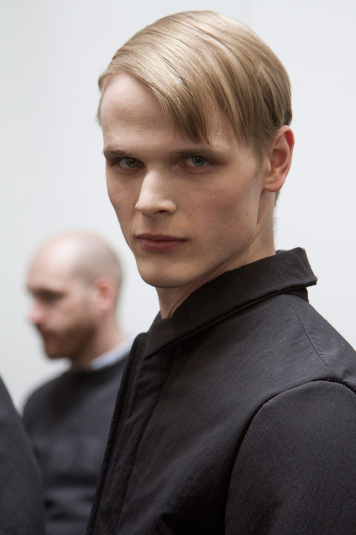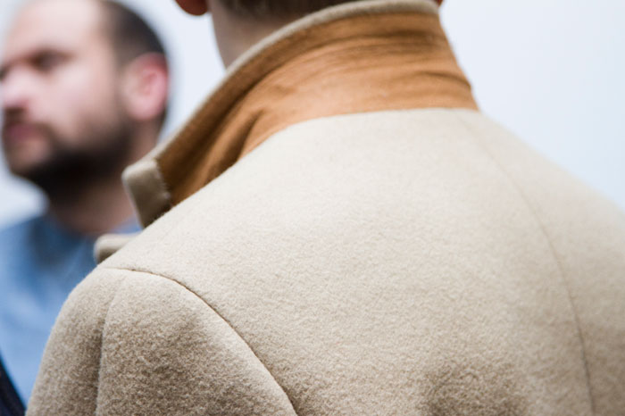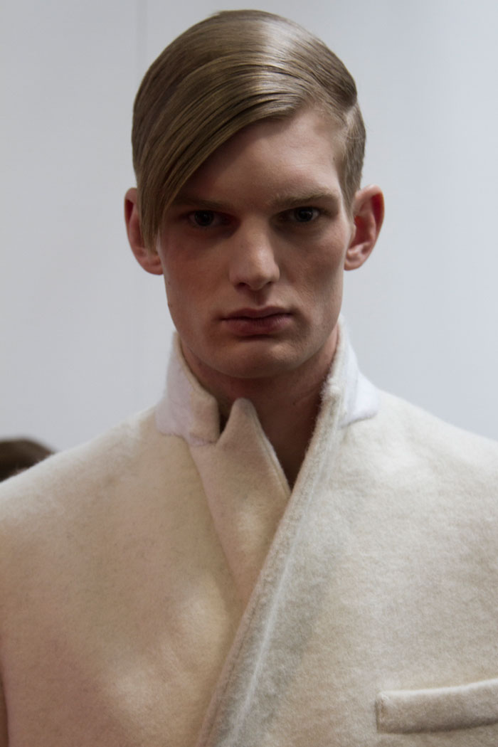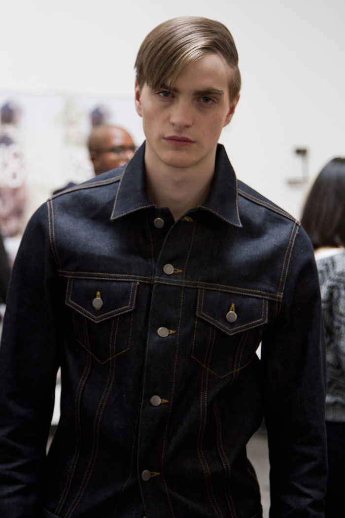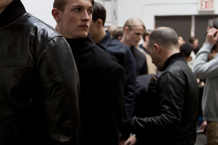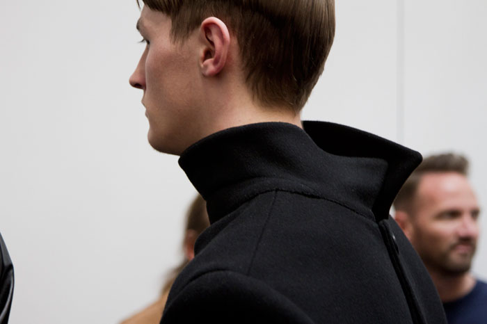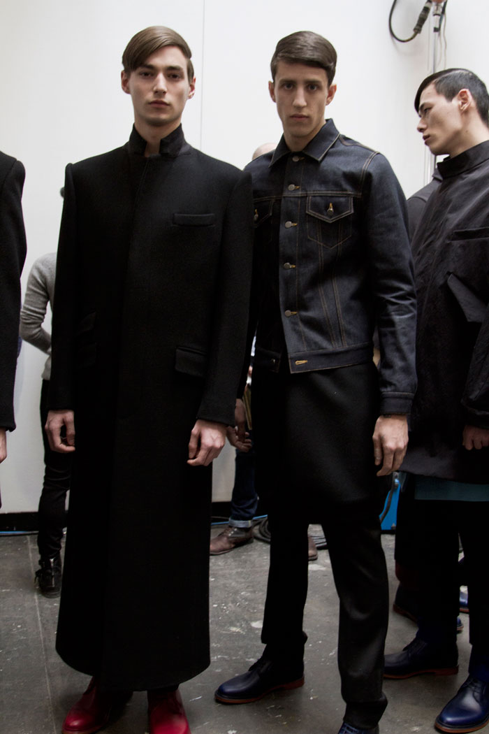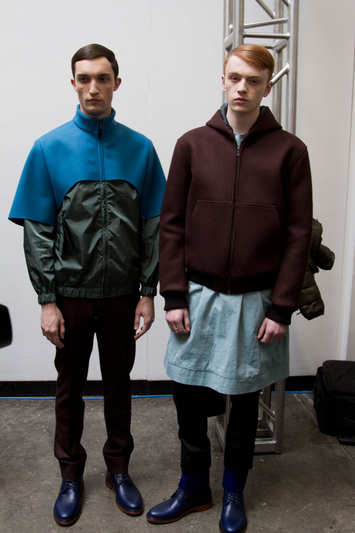 The message out of Milan and Paris for Fall 2013 was minimalism, a trend cemented here in New York by Duckie Brown’s strong, pared-down collection. The duo of Steven Cox and Daniel Silver have sent some memorably loud looks down their runways in the past, but this season was all about clean lines and smart cuts. The pair’s talent for playing with proportion remained intact, however, and that guideline added a rigor and structure to a collection that was otherwise shocking in its appearance of simplicity. The message here was layering, with a uniquely Duckie twist, with long overcoats under short jackets and trousers peeking out under other trousers. There was also, noticeably, a vibrant and rich palette, camel and plum with shots of hot pink and electric blue. Pants stayed slim and strictly pleated as jackets ballooned from skinny to oversized and back again, a hint at the subtle variations that worked underneath the surface details. Pick the show apart, and there were numerous strong statement pieces, like Robert Laby’s denim jacket or Jake Shortall’s hooded bomber. Branko Maselj wore two highly desirable outerwear items at once, a baggy play on a varsity jacket over a nubbly red topcoat. In terms of Duckie Brown’s continued experiments with the structures of menswear, this time around was an unqualified success.